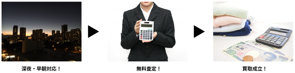 まずはお問い合わせ頂きまして、無料査定を行います。買取金額にご満足頂けましたら、その場で現金買取をさせて頂きます。お客様はご自宅から出ずに無料査定、買取金額の受け取りまで全て成立致します。